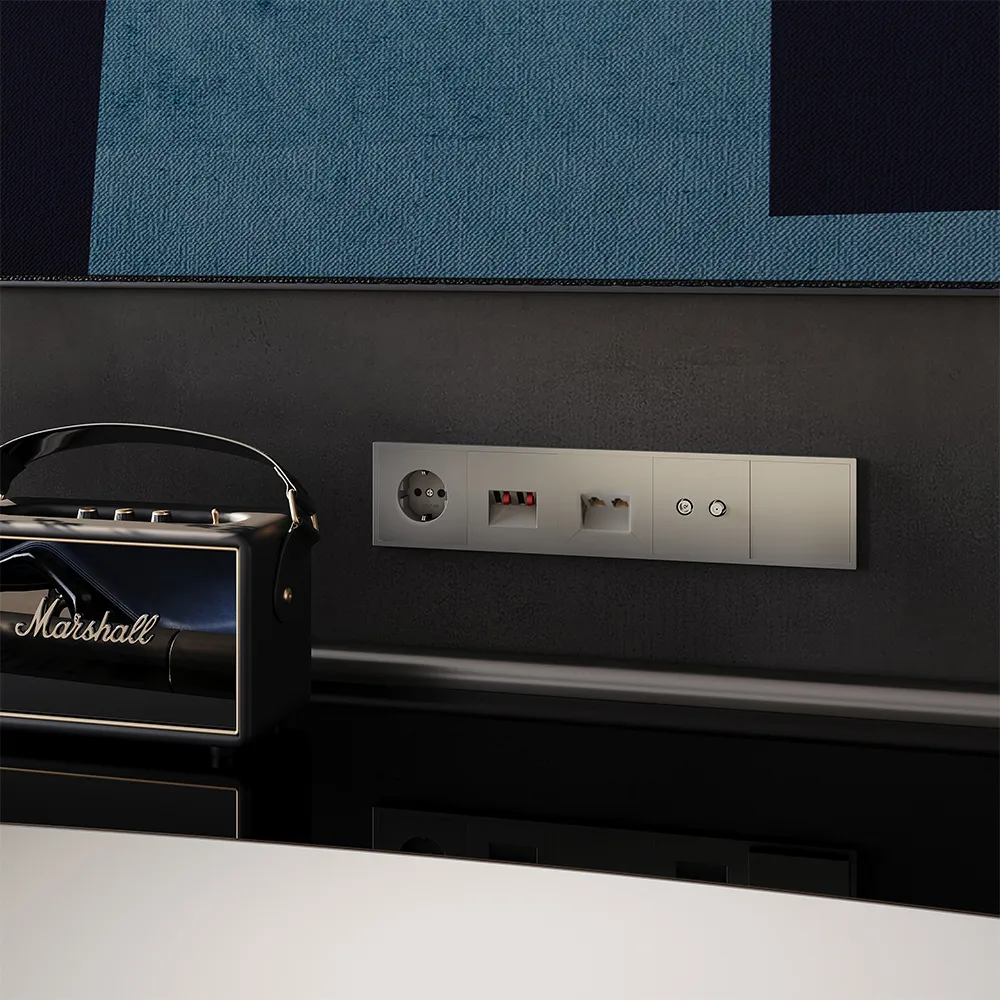 Розетка полностью совместима с пластиковыми и стеклянными рамками той же серии и гармонично вписывается в любые композиции из электрических розеток, выключателей и мультимедийных устройств VOLTUM S70.
