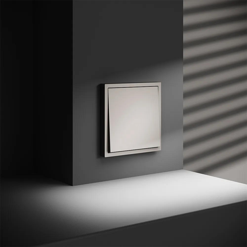 Проходной переключатель полностью совместим с пластиковыми и стеклянными рамками той же серии и гармонично вписывается в любую композицию из розеток, выключателей и умных устройств VOLTUM S70.